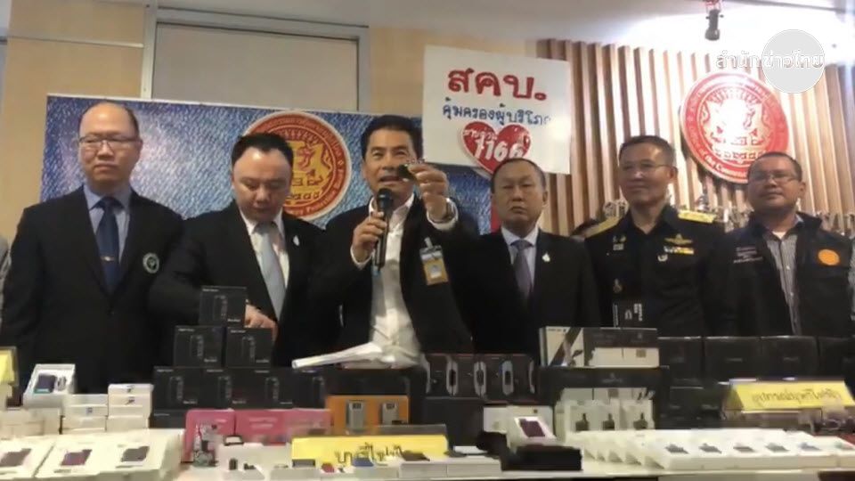 สคบ. 29 ส.ค.- นายเทวัญ ลิปตพัลลภ รัฐมนตรีประจำสำนักนายกรัฐมนตรี แถลงผลการจับกุมบุหรี่ไฟฟ้า ล็อตใหญ่ มูลค่ากว่า 10 ล้านบาท ว่า เป็นการจับกุมที่ขยายผลจากการตรวจยึดการขายบุหรี่ไฟฟ้า ด้วยการถ่ายทอดสดผ่านสื่อออนไลน์ เวลา 02.00 น. วันนี้ (29 ส.ค.) ที่บ้านเลขที่ 99 / 82 หมู่บ้านมัณฑนาซอย 10 ถนนประชาอุทิศ 72 พบของกลางเป็นบุหรี่ไฟฟ้า 6 ลัง น้ำยาเติมบุหรี่ไฟฟ้า 16 ลัง อุปกรณ์บุหรี่ไฟฟ้า 15 ลัง เป็น กล่องเล็ก 160 กล่อง สมุดรับโอนเงินลูกค้า 2 เล่ม ถือเป็นการฝ่าฝืนคำสั่งคณะกรรมการคุ้มครองผู้บริโภคที่ 9 / 2558 ในการห้ามขายบุหรี่ไฟฟ้าระหว่างโทษจำคุกไม่เกิน 3 ปี หรือปรับไม่เกิน 600,000 บาท หรือทั้งจำทั้งปรับ