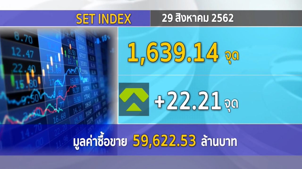 ผู้สื่อข่าวรายงานว่าดัชนีตลาดหลักทรัพย์ฯ ปิดวันนี้ (29 ส.ค.) ที่ระดับ 1,639.14 จุด เพิ่มขึ้น 22.21 จุด หรือ 1.37% มูลค่าการซื้อขาย 59,622.53 ล้านบาท ดัชนีเคลื่อนไหวแดนบวกตลอดทั้งวัน ทำระดับสูงสุด 1,639.17 จุด และต่ำสุด 1,621.06 จุด .- สำนักข่าวไทย