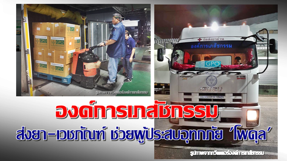 องค์การเภสัชกรรม แจ้งว่า ขณะนี้องค์การเภสัชกรรม ได้จัดส่งยาและเวชภัณฑ์เป็นการเร่งด่วนเพื่อช่วยเหลือประชาชนผู้ประสบอุทกภัยจากพายุโพดุล ในจังหวัดร้อยเอ็ด ประกอบด้วย