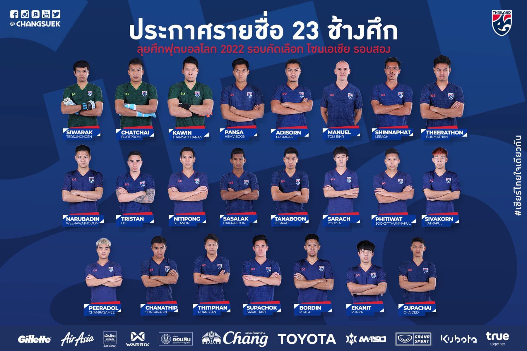 กุนซือวัย 64 ปี เรียกผู้เล่นมาทั้งหมด 33 คน จากนั้นเริ่มต้นเข้าแคมป์เก็บตัวฝึกซ้อม ตั้งแต่วันที่ 27 สิงหาคม ที่ผ่านมา และ ลงเล่นเกมกระชับมิตรแบบปิด 1 นัด ก่อนที่ล่าสุด จะตัดให้เหลือ 23 รายเป็นที่เรียบร้อย โดยมี 3 ราย ที่ติดทัพช้างศึกชุดใหญ่อย่างเป็นทางการครั้งแรก ประกอบด้วย ชินภัทร์ ลีเอาะ , เอกนิษฐ์ ปัญญา และ พิธิวัตต์ สุขจิตธรรมกุล