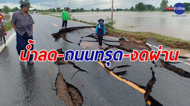 มหาสารคามน้ำลดแล้ว ทิ้งความเสียหายถนนทรุด-งดผ่าน