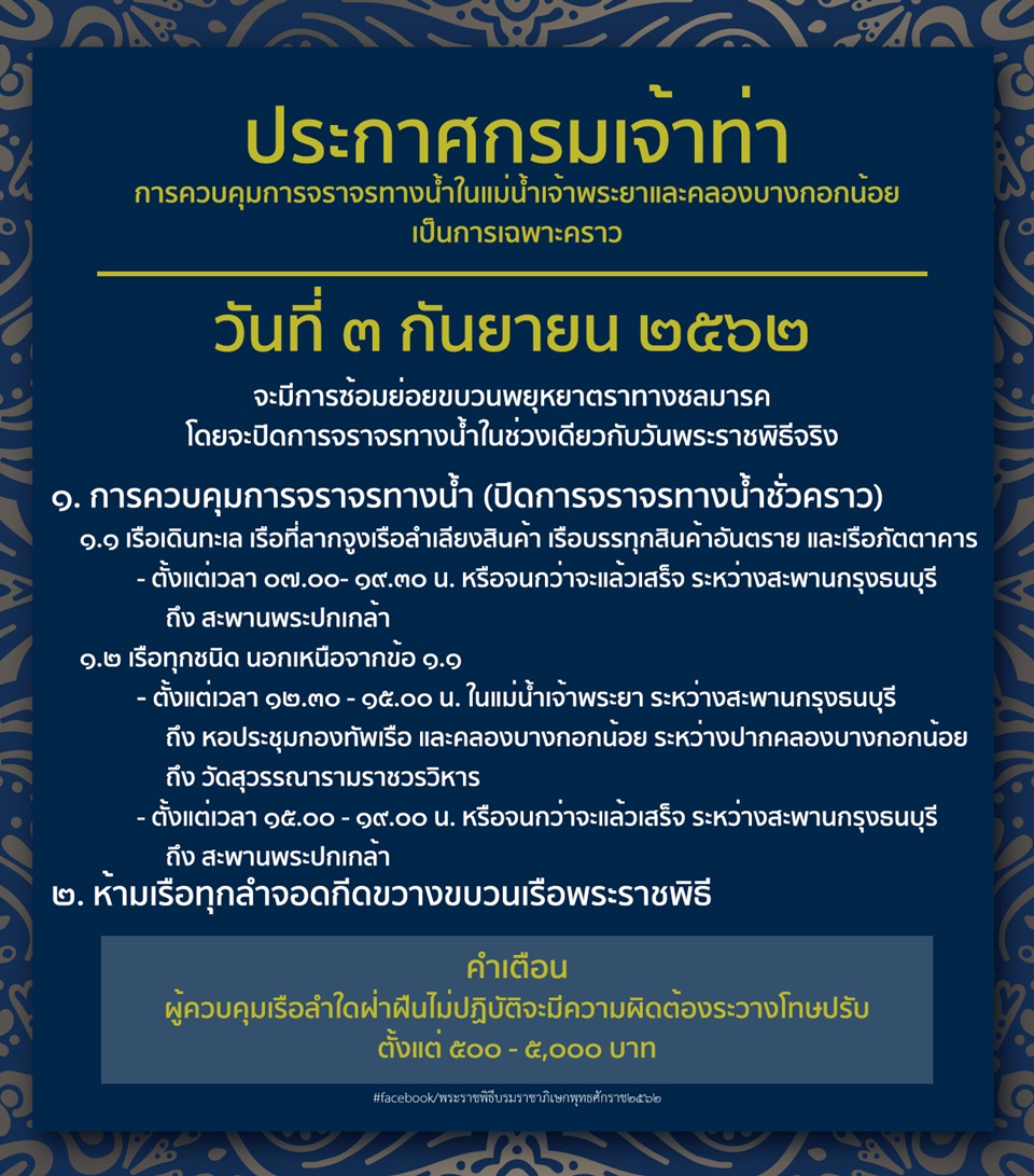 ด้วยวันที่ 3 กันยายน 2562 จะมีการซ้อมย่อยขบวนพยุหยาตราทางชลมารค ครั้งที่ 3 กรมเจ้าท่า แจ้งการปิดการจราจรทางน้ำชั่วคราว ดังนี้