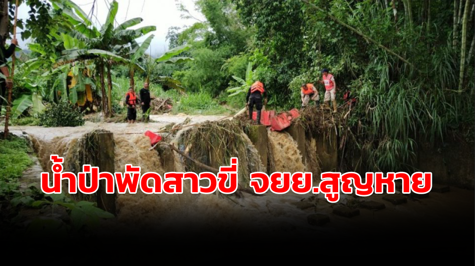 น่าน 2 ก.ย.- น้ำป่าน่านหลากเชี่ยวพัดชาวบ้านสูญหาย ขณะขับ จยย.ข้ามทางเบี่ยง เจ้าหน้าที่เร่งค้นหาเจอเพียงชิ้นส่วนรถ