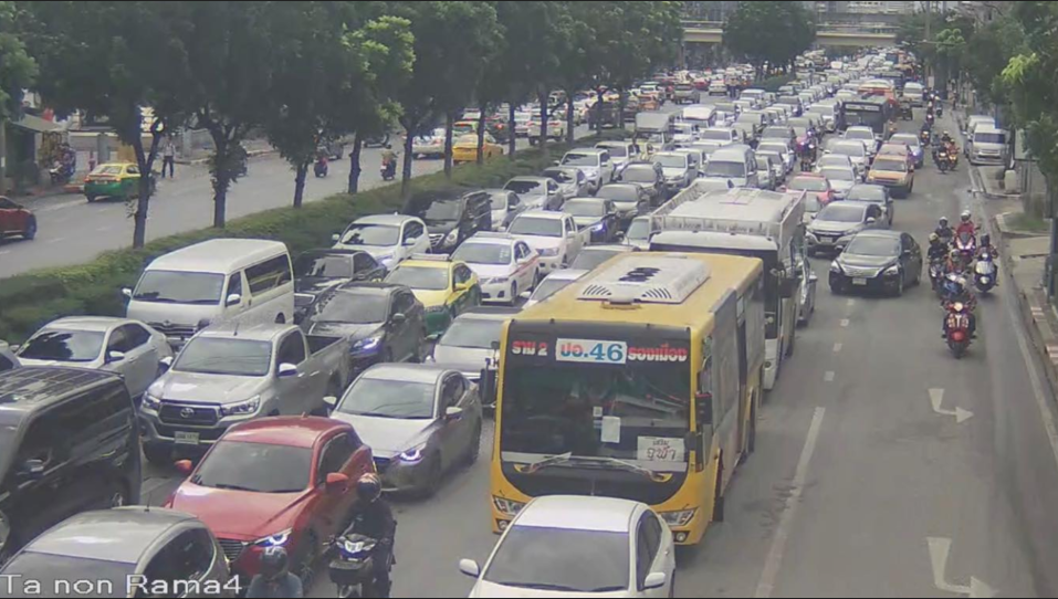 ถนนพระราม 4 ขาเข้า มุ่งหน้าใต้ด่วนพระราม 4 ต่อเนื่องแยกวิทยุ รถติดมาก ท้ายแถวสะสมหน้าตลาดคลองเตย