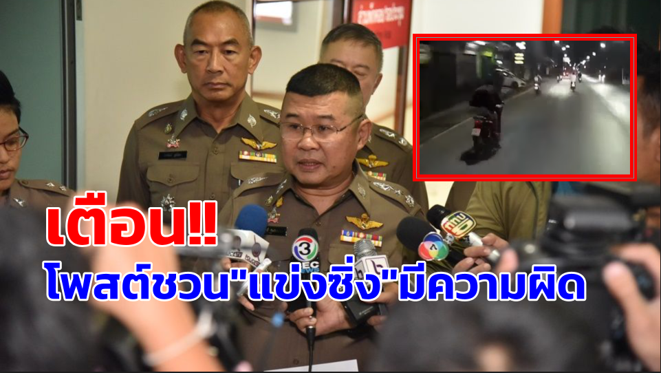 กรุงเทพฯ 3 ก.ย.- ตำรวจเตือนคนเล่นโซเชียลระวังให้ดี ใครโพสต์คลิปชวนไปแข่งรถซิ่ง ระวังถูกดำเนินคดีฐานเป็นผู้จัด สนับสนุน หรือส่งเสริมให้มีการแข่งรถในทาง ส่วนใครโพสต์จะไปด้วย ระวังเข้าข่ายเป็นผู้สนับสนุน ซึ่งโทษคือจำคุกไม่เกิน 3 เดือน ปรับ 2,000-20,000 บาท