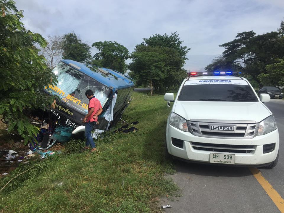 เมื่อเวลา 04.20 น. (10 ส.ค.) พ.ต.ท.โชคดี ศรีเมือง รักษาการ ผกก.สภ.จุฬาภรณ์ จ.นครศรีธรรมราช ประสานหน่วยกู้ภัยเร่งช่วยเหลืออุบัติเหตุรถชนกันรถโดยสารปรับอากาศ กรุงเทพ-ยะลา-เบตง ทะเบียน 15-3605 กทม. เสียหลักตกร่องกลางถนนสายเอเชีย 41 ม.1 ต.ทุ่งโพธิ์ มีผู้เสียชีวิต 2 ราย คือ นายพินัย ชัยศรียา อายุ 40 ปี คนขับ และผู้โดยสารชายยังไม่ทราบชื่อ ส่วนผู้บาดเจ็บกว่า 20 คน เจ้าหน้าที่ช่วยกันนำส่งโรงพยาบาลใกล้เคียง นอกจากนี้ ยังพบรถพ่วง 18 ล้อ บรรทุกปูนซีเมนต์มาเต็มคันตกอยู่ในร่องกลางถนนเช่นกัน