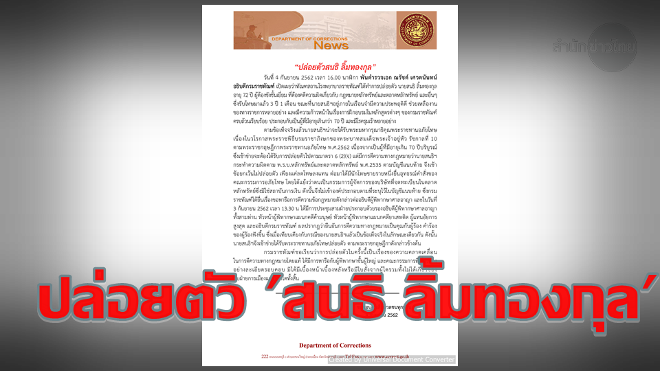 กรมราชทัณฑ์ 4ก.ย.-กรมราชทัณฑ์ ปล่อยตัว ‘สนธิ ลิ้มทองกุล’ แล้ววันนี้ เข้าหลักเกณฑ์ตามพระราชกฤษฎีกาพระราชทานอภัยโทษ พ.ศ.2562 ที่ผ่านมามีความคลาดเคลื่อนในการตีความทางกฎหมาย