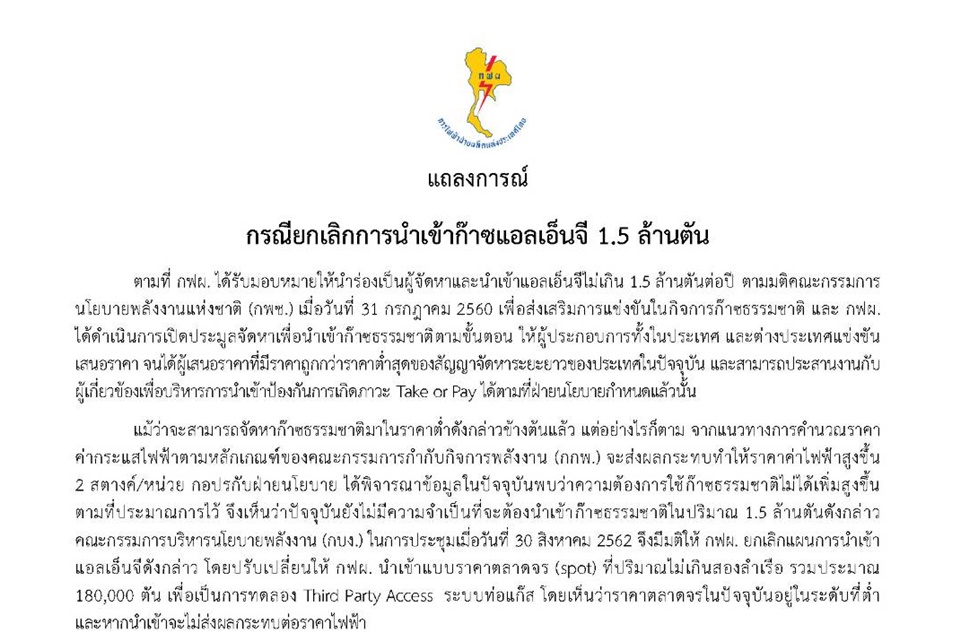 กรุุงเทพฯ 6 ก.ย. – ผู้บริหาร กฟผ.ออกแถลงการณ์ถึงพนักงาน ขณะที่มีกลุ่มเคลื่อนไหวเป็นห่วงมติ กบง.30 ส.ค.62 ล้มประมูลแอลเอ็นจี กฟผ.ติงทำให้เกิดการผูกขาดประชาชนเสียประโยชน์