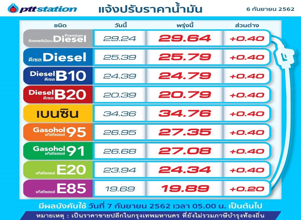ปตท.-บางจากฯ ปรับราคาน้ำมันทุกชนิดขึ้น 40 สต./ลิตร ยกเว้น E85 ปรับขึ้น 20 สต./ลิตร มีผล 7 กันยายน ตั้งแต่ 05.00 น.เป็นต้นไป โดยราคาขายปลีกเป็นดังนี้ เบนซิน 95 อยู่ที่ 34.76 บาท แก๊สโซฮอล์ 95 อยู่ที่ 27.35 บาท E20 อยู่ที่ 24.34 บาท แก๊สโซฮอล์ 91 อยู่ที่ 27.08 บาท E85 อยู่ที่ 19.89 บาท ดีเซล 25.79 บาท ดีเซลพรีเมี่ยม 29.64 บาท B10 อยู่ที่ 24.79 บาท และ B20 อยู่ที่ 20.79 บาทต่อลิตร โดยราคาขายปลีกข้างต้นยังไม่รวมภาษีบำรุงกรุงเทพมหานคร.-สำนักข่าวไทย