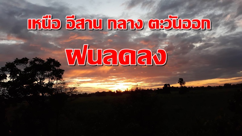 • ภาคตะวันออกเฉียงเหนือ มีเมฆเป็นส่วนมาก กับมีฝนฟ้าคะนองร้อยละ 30 ของพื้นที่ ส่วนมากบริเวณจังหวัดหนองบัวลำภู อุดรธานี บึงกาฬ สกลนคร นครพนม มุกดาหาร ชัยภูมิ ขอนแก่น และอุบลราชธานี อุณหภูมิต่ำสุด 24-26 องศาเซลเซียส อุณหภูมิสูงสุด 34-35 องศาเซลเซียส