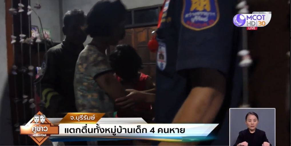 เมื่อวานนี้ (7 ก.ย.-) ผู้สื่อข่าวได้ลงพื้นที่พบกับนายปรมะ สมหวัง ผู้ใหญ่บ้านหนองม่วง ม.6 ต.บ้านไทร อ.ประโคนชัย จ.บุรีรัมย์ พร้อมด้วยหน่วยกู้ภัยสว่างจรรยาธรรมสถานบุรีรัมย์ นำชาวบ้านกว่า 200 คน ระดมหาเด็กในหมู่บ้านจำนวน 4 คน เป็นชาย 1 คน หญิง 4 คน อายุระหว่าง 6-15 ปี ทั้งหมดหายออกไปจากบ้านตั้งแต่เวลา 16.00 น. จนกระทั่งตกดึกก็ยังไม่พบวี่แววของเด็กทั้ง 4 คน