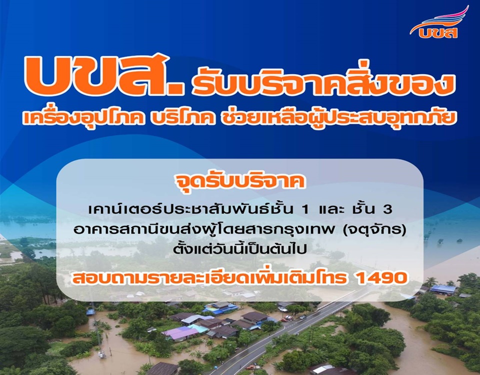ทั้งนี้ สามารถร่วมบริจาคสิ่งของช่วยเหลือผู้ประสบอุทกภัยได้ที่จุดรับบริจาค ณ เคาน์เตอร์ประชาสัมพันธ์ ชั้น 1 และชั้น 3 อาคารสถานีขนส่งผู้โดยสารกรุงเทพ (จตุจักร) ตั้งแต่บัดนี้เป็นต้นไป สอบถามข้อมูลเพิ่มเติมโทร Call Center 1490 เรียก บขส. ตลอด 24 ชั่วโมง.-สำนักข่าวไทย