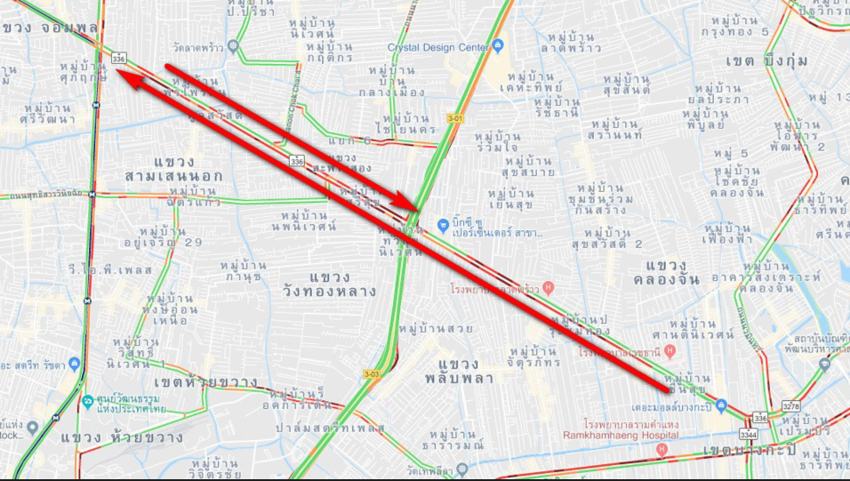 ถนนลาดพร้าว ขาเข้า จากบางกะปิ มุ่งหน้าแยกโชคชัย4 – แยกภาวนา เข้าแยกรัชดา-ลาดพร้าว รถมาก ท้ายแถวสะสมตรงข้าม รพ.เวชธานี ขาออก ติดเข้าใต้ด่วนลาดพร้าว เข้าถนนประดิษฐ์มนูธรรม มุ่งหน้าแยกประชาธรรม ท้ายแถวสะสมแยกโชคชัย4