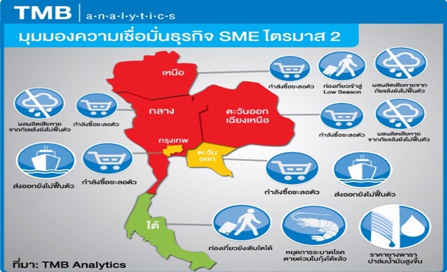 นายเบญจรงค์ สุวรรณคีรี หัวหน้านักวิเคราะห์ ศูนย์วิเคราะห์เศรษฐกิจทีเอ็มบี เปิดเผยว่า ดัชนีความเชื่อมั่นผู้ประกอบการขนาดย่อม-ทีเอ็มบีไตรมาส 2/2559 จากความเห็นของผู้ประกอบการเอสเอ็มอี 1,262 กิจการทั่วประเทศ พบว่าดัชนีความเชื่อมั่นของผู้ประกอบการปรับลดลงอยู่ที่ 39.4 จาก 42.1 ในไตรมาสก่อน เนื่องจากผู้ประกอบการทั่วประเทศกังวลภาวะเศรษฐกิจและกำลังซื้อในประเทศที่ยังคงชะลอตัว และผลกระทบจากปัญหาภัยแล้งที่ต่อเนื่องจากไตรมาสก่อนหน้า ซึ่งยังส่งผลกระทบกับรายได้เกษตรกรซึ่งเป็นกำลังซื้อสำคัญของผู้ประกอบการเอสเอ็มอีในส่วนภูมิภาค
