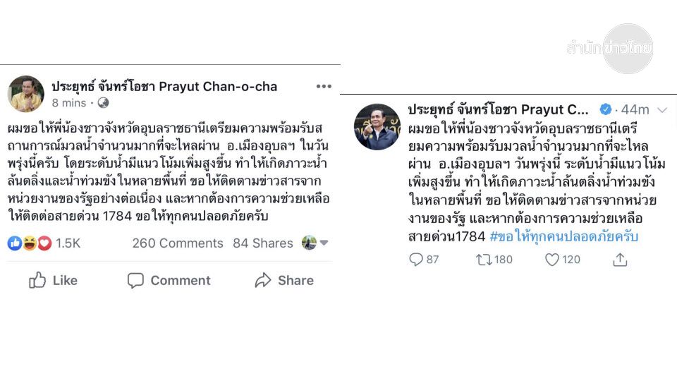 กรุงเทพฯ 12 ก.ย.- พล.อ.ประยุทธ์ จันทร์โอชา นายกรัฐมนตรี โพสต์ข้อความผ่านโซเชียลมีเดีย ทั้งเฟซบุ๊ก และทวิตเตอร์ “ประยุทธ์ จันทร์โอชา Prayut Chan-o-cha” มีข้อความว่า “ผมขอให้พี่น้องชาวจังหวัดอุบลราชธานีเตรียมความพร้อมรับสถานการณ์มวลน้ำจำนวนมากที่จะไหลผ่าน อ.เมืองอุบลฯ ในวันพรุ่งนี้ครับ โดยระดับน้ำมีแนวโน้มเพิ่มสูงขึ้น ทำให้เกิดภาวะน้ำล้นตลิ่งและน้ำท่วมขังในหลายพื้นที่ ขอให้ติดตามข่าวสารจากหน่วยงานของรัฐอย่างต่อเนื่อง และหากต้องการความช่วยเหลือ ให้ติดต่อสายด่วน 1784 ขอให้ทุกคนปลอดภัยครับ” . – สำนักข่าวไทย