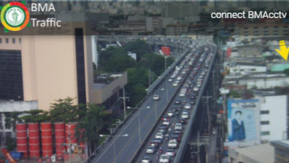 ยกระดับรามคำแหง และถนนรามคำแหง ขาเข้ามุ่งหน้าแยกรามคำแหง เข้าแยกคลองตัน ติดขัดมาก ท้ายแถวสะสมโค้ง ม.รามคำแหง