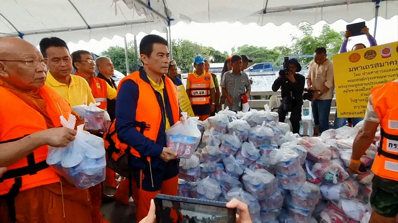 ด้านนายเทวัญ ลิปตพัลลภ รัฐมนตรีประจำสำนักนายกรัฐมนตรี พร้อมเจ้าประคุณสมเด็จพระมหาธีราจารย์ ประธานคณะกรรมการฝ่ายสาธารณสงเคราะห์ มหาเถรมาคม และนายเธียรชัย พุทธรังสี รองผู้ว่าราชการจังหวัดอุบลราชธานี ร่วมกันมอบปิยภัณฑ์พระสงฆ์ และถุงยังชีพแก่ประชาชนประสบภัยน้ำท่วม