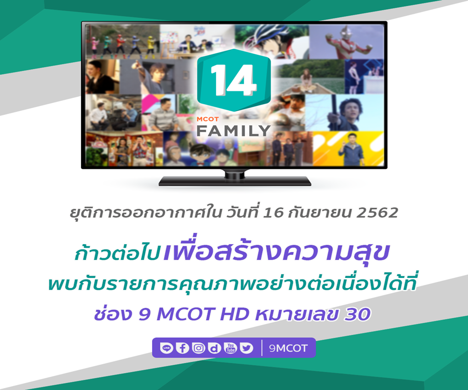นายเขมทัตต์ พลเดช กรรมการผู้อำนวยการใหญ่ บริษัท อสมท จำกัด (มหาชน) เปิดเผยว่า อสมท จะยุติการออกอากาศโทรทัศน์ระบบดิจิทัล ช่อง 14 MCOT Family โดยจะออกอากาศวันสุดท้าย 15 กันยายน 2562 ถึงเวลา 24.00 น. และยุติการออกอากาศตั้งแต่วันที่ 16 กันยายน 2562 เป็นต้นไป ตามการพิจารณาของคณะกรรมการกิจการกระจายเสียง กิจการโทรทัศน์ และกิจการโทรคมนาคมแห่งชาติ (กสชท.) โดยจะยังคงนำเสนอรายการที่เต็มเปี่ยมด้วยสาระความรู้และความบันเทิงที่เป็นประโยชน์ต่อสังคมทางช่อง 9 MCOT HD หมายเลข 30