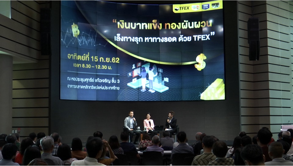 นางสาวรินใจ ชาครพิพัฒน์ กรรมการผู้จัดการ บมจ.ตลาดสัญญาซื้อขายล่วงหน้า (ประเทศไทย) เป็นประธานเปิดงานสัมมนา “เงินบาทแข็ง ทองผันผวน เล็งทางรุก หาทองรอด ด้วย TFEX” ณ ตลาดหลักทรัพย์แห่งประเทศไทย (ตลท.) พร้อมมอบรางวัล Phillip-TFEX Trading Challenge 2019 ให้กับนักลงทุนที่สร้างผลตอบแทนสูงสุดแต่ละเดือน