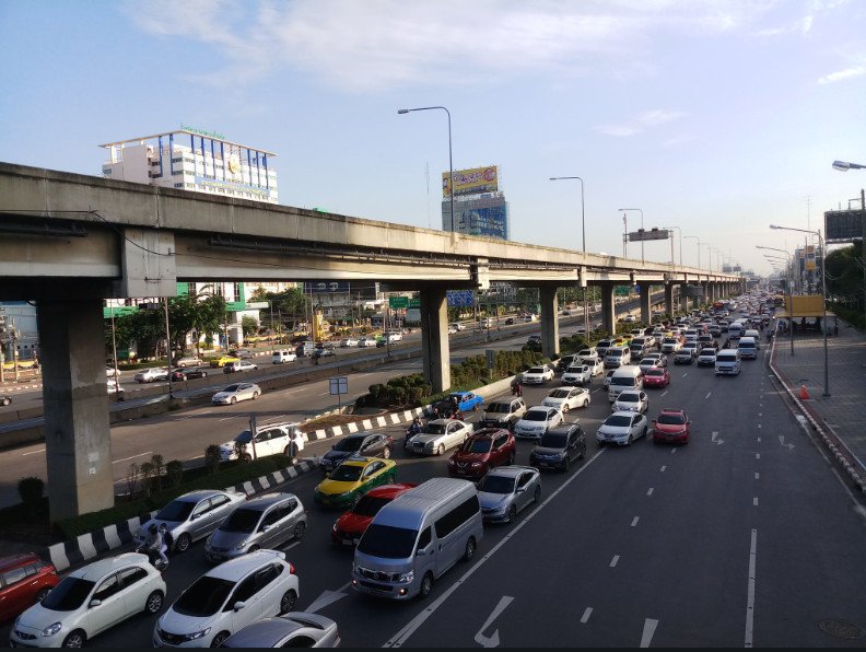 ถนนสุขุมวิท ขาออก ผ่านหน้าเมืองโบราณ จ.สมุทรปราการ ติดขัด ท้ายแถวสะสมอยู่ที่ใต้บีทีเอสสถานีเคหะฯ