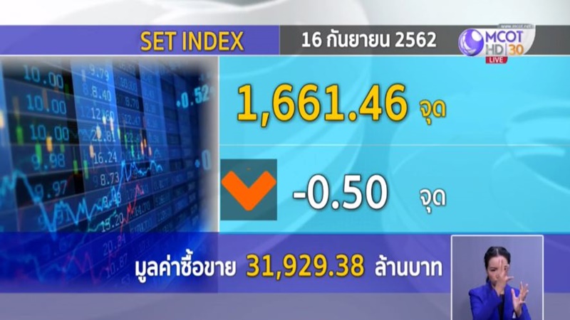 ตลาดหุ้นไทยช่วงเที่ยงปิดลบ 0.50 จุด