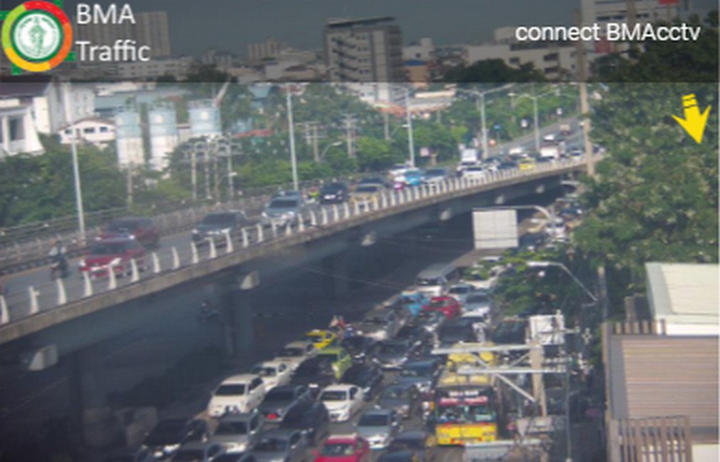 ถนนสามเสน ขาเข้า มุ่งหน้าแยกซังฮี้ รถติดขัดมาก ท้ายแถวสะสมอยู่ที่แยกศรีย่าน.-สำนักข่าวไทย