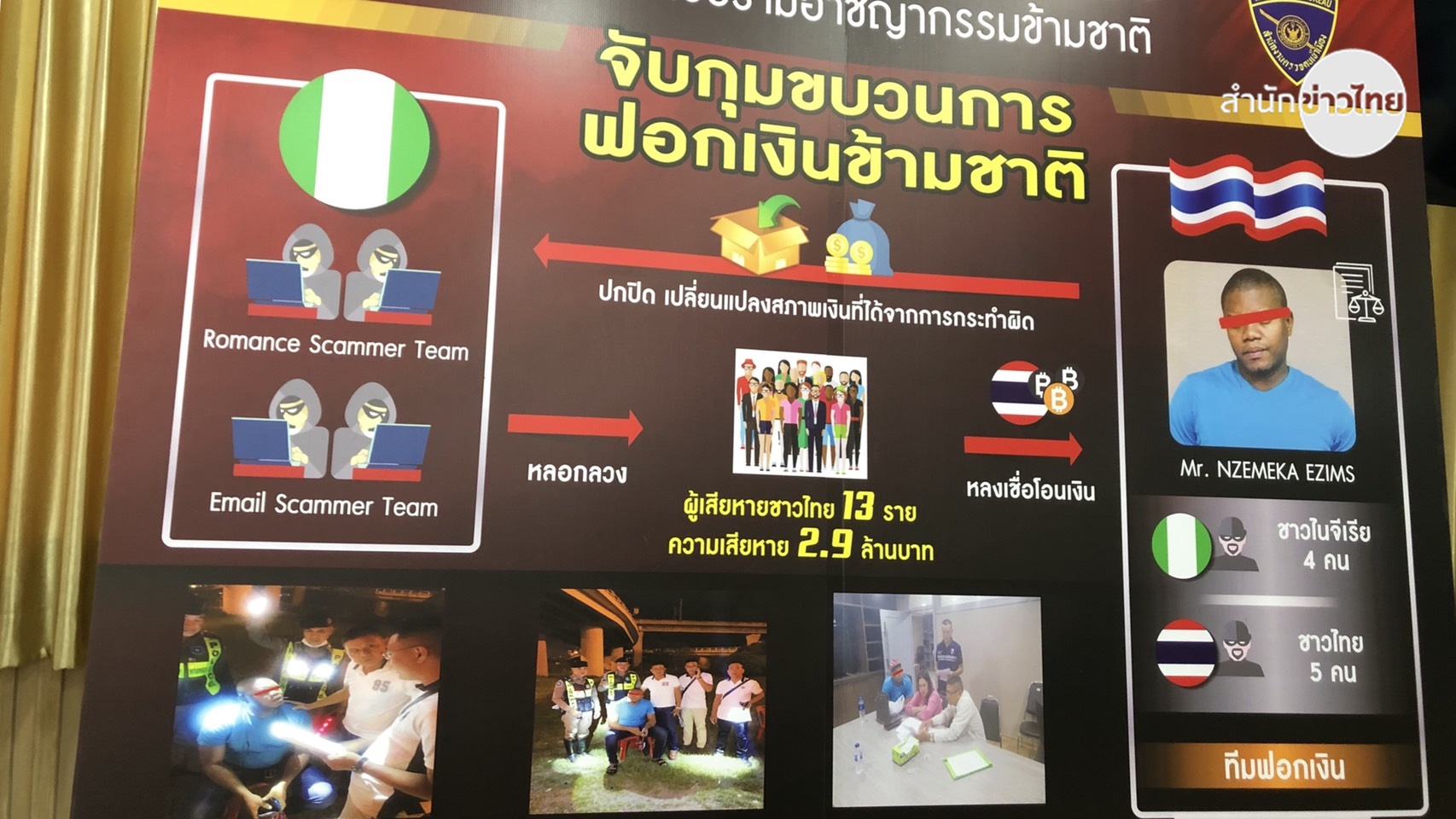 สืบเนื่องจากเดือนมิถุนายนปีก่อนได้ก่อเหตุฉ้อโกงประชาชนในลักษณะ Romance Scam มีผู้เสียหาย 13 ราย ในหลายท้องที่จนเหยื่อหลงโอนเงินให้กลุ่มคนร้าย รวมมูลค่าเสียหาย 2.9 ล้านบาท ต่อมาชุดสืบสวนจับกุมหญิงไทย รับหน้าที่กดเงินเพื่อโอนต่อไปยังบัญชีคนร้าย จึงขยายผลเอาผิดกลุ่มคนร้ายฐานฟอกเงิน มีไนจีเรีย 5 คนและคนไทย 5 คน