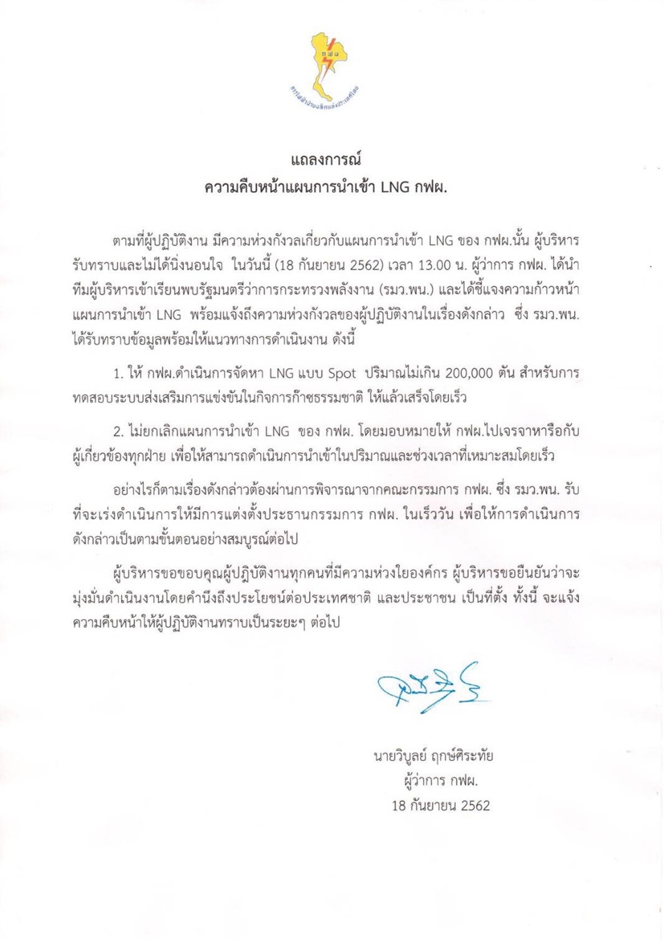 ด้านนายวิบูลย์ ฤกษ์ศิระทัย ผู้ว่าการ กฟผ. ออกแถลงการณ์เกี่ยวกับการนำเข้าแอลเอ็นจี ฉบับที่ 2 วานนี้ (18 ก.ย.) ระบุว่าตามที่ผู้ปฏิบัติงานมีความห่วงกังวลเกี่ยวกับแผนการนำเข้า LNG ของ กฟผ.นั้น ผู้บริหาร รับทราบและไม่ได้นิ่งนอนใจ เมื่อวันที่ 18 กันยายน ทีมผู้บริหารได้เข้าเรียน รมว.พลังงาน ชี้แจงความก้าวหน้าแผนการนำเข้าพร้อมแจ้งถึงความห่วงกังวลของผู้ปฏิบัติงานในเรื่องดังกล่าว