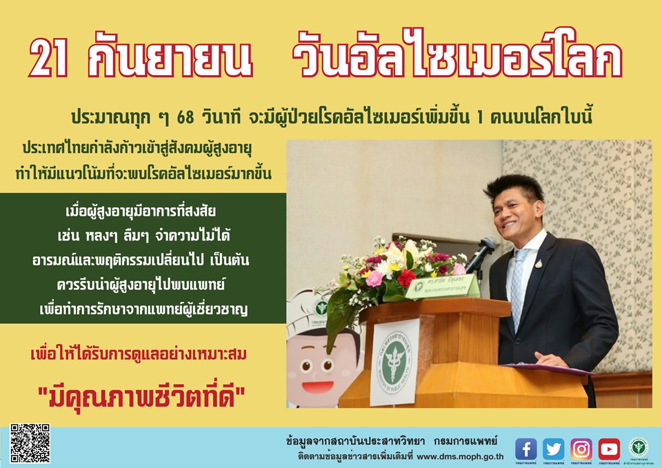 นายสาธิต ปิตุเตชะ รัฐมนตรีช่วยว่าการกระทรวงสาธารณสุข กล่าวว่า องค์การอัลไซเมอร์ระหว่างประเทศ (Alzheimer’s Disease International; ADI) ได้ประกาศให้วันที่ 21 กันยายนของทุกปีเป็นวันอัลไซเมอร์โลก ซึ่งโรคอัลไซเมอร์เป็นสาเหตุอันดับ 1 ของอาการสมองเสื่อมในวัยสูงอายุ โดย ประมาณทุกๆ 68 วินาทีจะมีผู้ป่วยโรคอัลไซเมอร์เพิ่มขึ้น 1 คนบนโลกใบนี้ ขณะที่ปัจจุบันประเทศไทยมีผู้สูงอายุประมาณ 7 ล้านคน