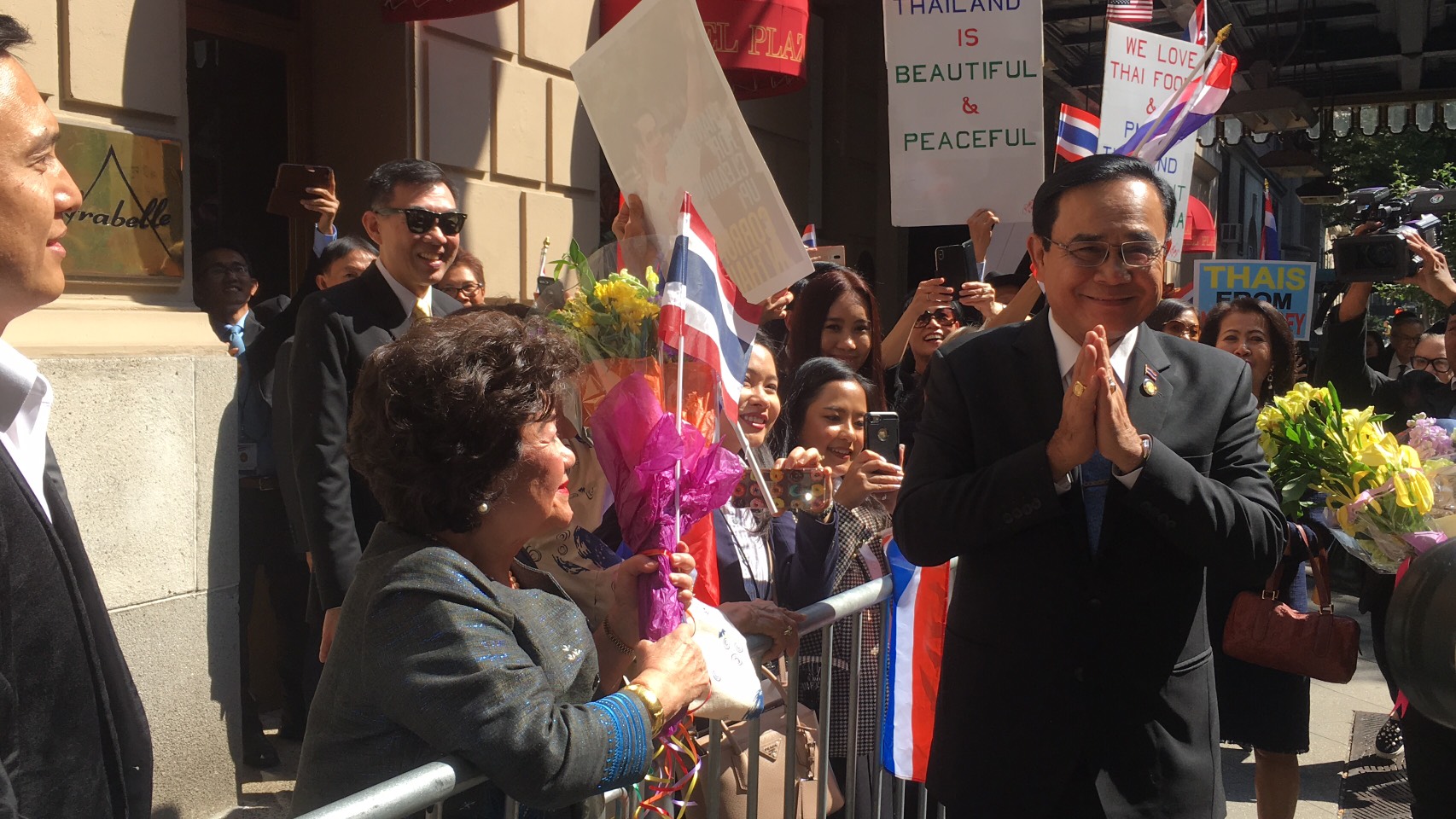 พล.อ.ประยุทธ์ จันทร์โอชา นายกรัฐมนตรีและรัฐมนตรีว่าการกระทรวงกลาโหม พร้อมภริยา และคณะ ได้เดินทางถึงท่าอากาศยานนานาชาติจอห์น เอฟ เคเนดี้ นครนิวยอร์ก เมื่อเวลาประมาณ 11.05 น.ตามเวลาท้องถิ่น ซึ่งช้ากว่าเวลาประเทศไทย 11 ชั่วโมง ภายหลังเดินทางจากประเทศไทยตั้งแต่คืนวันที่ 21 กันยายนที่ผ่านมา และในเวลา 12.20น.ตามเวลาท้องถิ่น นายกรัฐมนตรี ได้เดินทางถึงโรงแรมพลาซ่าแอทธินี ซึ่งเป็นโรงแรมที่พักแล้ว โดยกลุ่มคนไทยในนิวยอร์ก และคนไทยที่อาศัยอยู่ในรัฐต่างๆของอเมริกา มารอต้อนรับ พร้อมชูป้ายสนับสนุนและมอบดอกไม้ให้กำลังใจแก่นายกรัฐมนตรี นางสาวศิริมา บุญชื่น อายุ 62 มาจากนิวยอร์ก ตัวแทนกลุ่มคนไทยในนิวยอร์ก กล่าวว่า มาต้อนรับนายกรัฐมนตรี ตลอด 5 ปี ที่ปฏิบัติหน้าที่นายกรัฐมนตรี ซึ่งถือเป็นครั้งที่ 4 แล้ว ที่มาให้กำลังใจนายกรัฐมนตรีในสหรัฐอเมริกา พร้อมบอกเหตุผลที่ชื่นชอบนายกรัฐมนตรีว่าเป็นคนที่พูดจริงทำจริง รักประเทศชาติ ศาสนาและพระมหากษัตริย์ รวมถึงมีบุคลิกที่แม้ภายนอกจะดูเคร่งขรึมแต่ภายในเป็นคนมีจิตใจดี และอวยพรให้นายกรัฐมนตรีมีสุขภาพแข็งแรงและเป็นนายกรัฐมนตรีอีกหลายสมัย