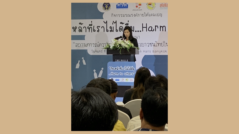 ด้าน ภญ.อรทัย วลีวงศ์ สำนักงานพัฒนานโยบายสุขภาพระหว่างประเทศ กระทรวงสาธารณสุขได้นำเสนอผลงานงานวิจัย ภัยเหล้าที่เราไม่ได้ดื่มโดยระบุว่างานวิจัยนี้เป็นส่วนหนึ่งของการศึกษาผลกระทบของการบริโภคเครื่องดื่มแอลกอฮอล์ต่อบุคคลรอบข้างผู้ดื่มในประเทศไทย (Thailand Alcohol’s Harm to Others project) ซึ่งศึกษาการได้รับผลกระทบมือสองหรือผลกระทบด้านลบจากการดื่มในมิติต่าง ๆ ของคนในครอบครัว ญาติ พี่น้อง เพื่อน และเพื่อนร่วมงานของผู้ดื่ม รวมทั้งผลกระทบจากการดื่มของคนแปลกหน้าในสังคมต่อบุคคลอื่นที่อยู่รอบข้าง พบว่าร้อยละ 25 รายงานว่าเด็กในความดูแลของตนเคยได้รับผลกระทบจากการดื่มแอลกฮอล์ของใครบางคนอย่างใดอย่างหนึ่ง เช่น ถูกดุด่าอย่างรุนแรงร้อยละ 7.4 อยู่ในเหตุการณ์ความรุนแรงในครอบครัวร้อยละ 7.4 ถูกทอดทิ้ง/ถูกปล่อยให้อยู่ในสถานการณ์ที่ไม่ปลอดภัย ร้อยละ 3.5 ถูกตี ทำร้ายร่างกาย ร้อยละ 1.7