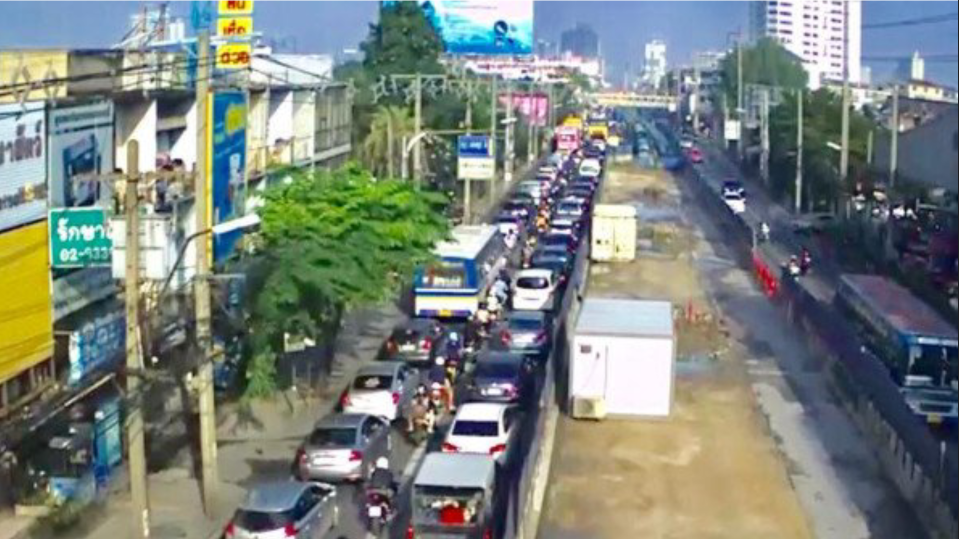 ถนนศรีนคริทร์ ขาเข้า มุ่งหน้าแยกพัฒนาการ รถติดขัดมาก ท้ายแถวสะสมอยู่ที่ตรงข้ามธัญญาพาร์ค ศรีนครินทร์