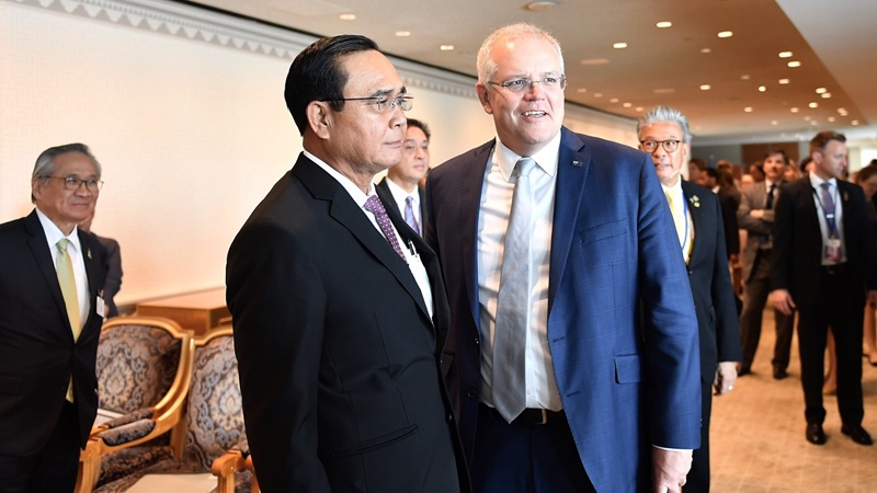 จากนั้นเวลา 12.00 น. นายกรัฐมนตรีได้พบหารือกับนายสกอตต์ มอร์ริสัน นายกรัฐมนตรีเครือรัฐออสเตรเลีย โดยนายกรัฐมนตรีแสดงความชื่นชมการบริหารงานด้านเศรษฐกิจของรัฐบาลออสเตรเลีย ซึ่งทำให้เศรษฐกิจโดยรวมของออสเตรเลียเติบโตขึ้นอย่างมาก โดยนายกรัฐมนตรีได้เน้นย้ำความสำคัญของความตกลง RCEP ต่อการเติบโตและเสถียรภาพทางเศรษฐกิจของภูมิภาค ซึ่งไทยในฐานะประธานอาเซียนจะร่วมมืออย่างใกล้ชิดกับออสเตรเลีย เพื่อบรรลุเป้าหมายร่วมในการเจรจา RCEP ให้มีผลอย่างเป็นรูปธรรมภายในปีนี้ และแสดงความสนใจเข้าร่วม CPTPP ที่ว่าด้วยความตกลงที่ครอบคลุมและก้าวหน้าสำหรับหุ้นส่วนทางเศรษฐกิจภาคพื้นแปซิฟิก โดยเป็นความตกลงการค้าเสรีที่ครอบคลุมในเรื่องการค้า การบริการ และการลงทุน เพื่อสร้างมาตรฐานและกฎระเบียบร่วมกันระหว่างประเทศสมาชิก ทั้งในประเด็นการคุ้มครองทรัพย์สินทางปัญญา มาตรฐานแรงงาน กฎหมายสิ่งแวดล้อม รวมถึงกลไกแก้ไขข้อพิพาทระหว่างรัฐบาลและนักลงทุนต่างชาติ