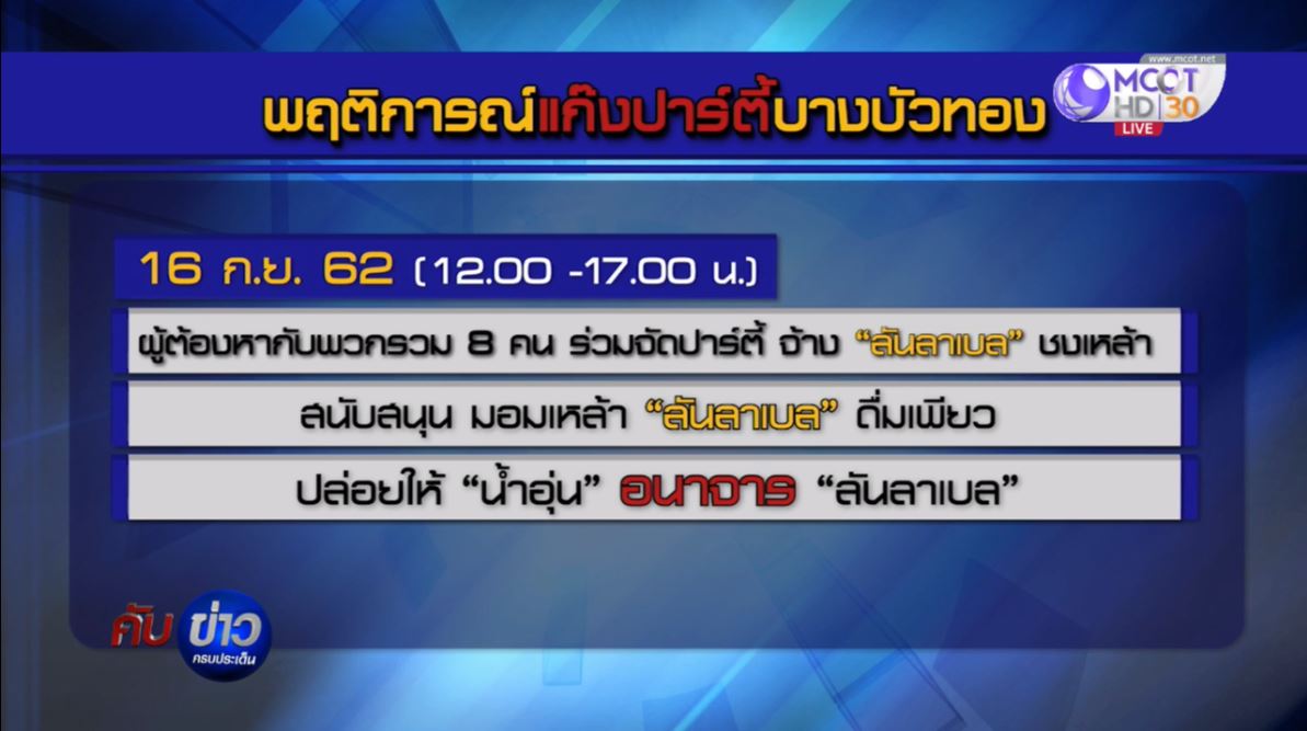 สำหรับคำร้องระบุพฤติการณ์สรุปว่า เมื่อวันที่ 16 ก.ย.62 เวลาประมาณ 12.00 น.–17.00 น. ผู้ต้องหากับพวกรวม 8 คน ได้ร่วมกันจัดงานปาร์ตี้และได้จ้าง น.ส.ธิติมา หรือ “ลันลาเบล” นรพันธ์พิพัฒน์ ซึ่งเป็นพริตตี้มาเป็นเด็กเอนเตอร์เทนในการชงเหล้าให้กับผู้ต้องหากับพวกในงาน จากนั้นผู้ต้องหากับพวกได้ร่วมกันสนับสนุน หรือมอมสุรา และคะยั้นคะยอ ส่งเสริมให้ “ลันลาเบล” ดื่มสุราในลักษณะดื่มเพียวจนเป็นเหตุให้ “ลันลาเบล” เมาและหมดสติที่ห้องจัดปาร์ตี้ดังกล่าว หลังจากนั้นได้ปล่อยนายรัชเดช หรือ “น้ำอุ่น” วงศ์ทะบุตร กระทำอนาจาร โดยพา “ลันลาเบล” ไปที่คอนโดฯ ก่อนก่อเหตุ