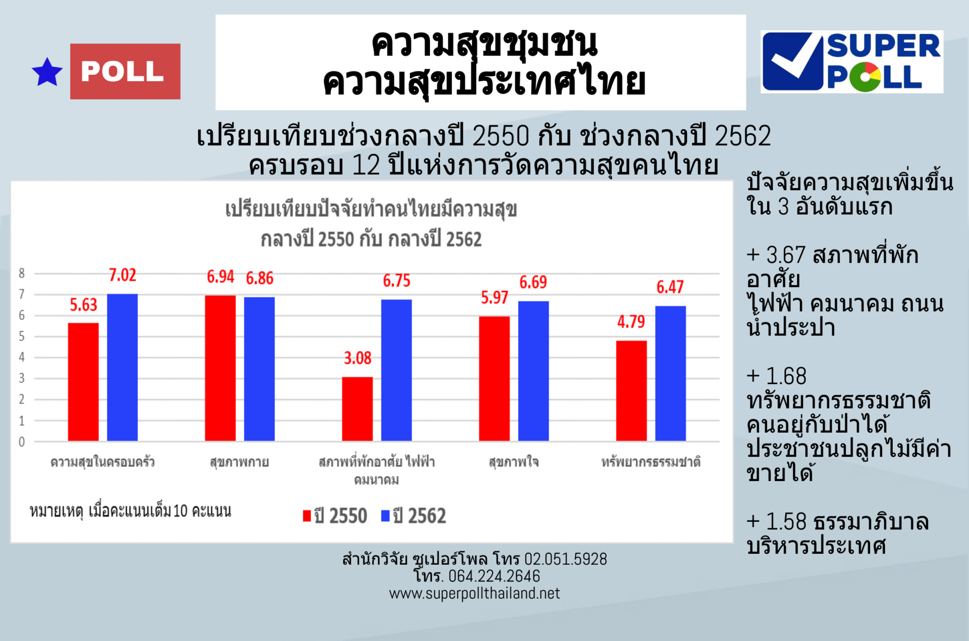 ผู้ช่วยศาสตราจารย์ ดร.นพดล กรรณิกา ผู้อำนวยการสำนักวิจัยซูเปอร์โพล (SUPER POLL) มูลนิธิสถาบันวิจัยความสุขชุมชนและความเป็นผู้นำกล่าวว่า จากการศึกษาวิจัยความสุขประเทศไทย เปรียบเทียบระหว่าง กลางปี 2550 กับ กลางปี 2562 ช่วงระยะเวลาครบ 12 ปีพอดี พบการเปลี่ยนแปลงความสุขของประชาชนคนไทยที่น่าพิจารณาหลายปัจจัย โดยพบว่า ความสุขของคนไทยที่ได้คะแนนสูงสุด เมื่อคะแนนเต็ม 10 คะแนน คือ ความสุขในครอบครัว ได้ 7.02 คะแนน รองลงมาอันดับสอง ได้แก่ สุขภาพกาย ได้ 6.86 คะแนน อันดับสามได้แก่ สภาพที่พักอาศัย ไฟฟ้า คมนาคม ถนนหนทาง น้ำประปา ได้ 6.75 คะแนน อันดับสี่ ได้แก่ สุขภาพใจ ได้ 6.69 คะแนน และอันดับห้า ได้แก่ ทรัพยากรธรรมชาติ คนอยู่กับป่าได้ ประชาชนปลูกไม้มีค่าขายได้ ได้ 6.47 คะแนน