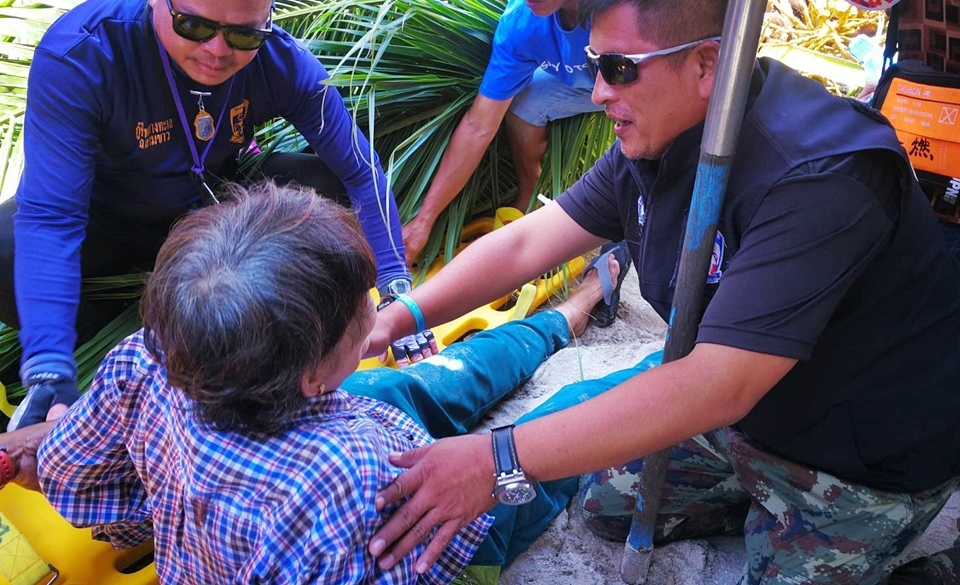 ที่เกิดเหตุพบผู้ได้รับบาดเจ็บชื่อ นางดวงใจ ดำขำ อายุ 77 ปี แม่ค้าเดินเร่ขายขนุน ถูกต้นมะพร้าวยาวกว่า 5 เมตรที่หักโค่นลงมาทับร่าง ทำให้ขาหัก ร่มและเก้าอี้ชายหาดพังเสียหายกู้ภัยและเจ้าหน้าที่ฉลามขาวเร่งช่วยกันเอาต้นมะพร้าวขนาดใหญ่ออก แล้วนำตัวนางดวงใจส่งรักษาที่ โรงพยาบาลมหาวิทยาลัยบูรพาทันที