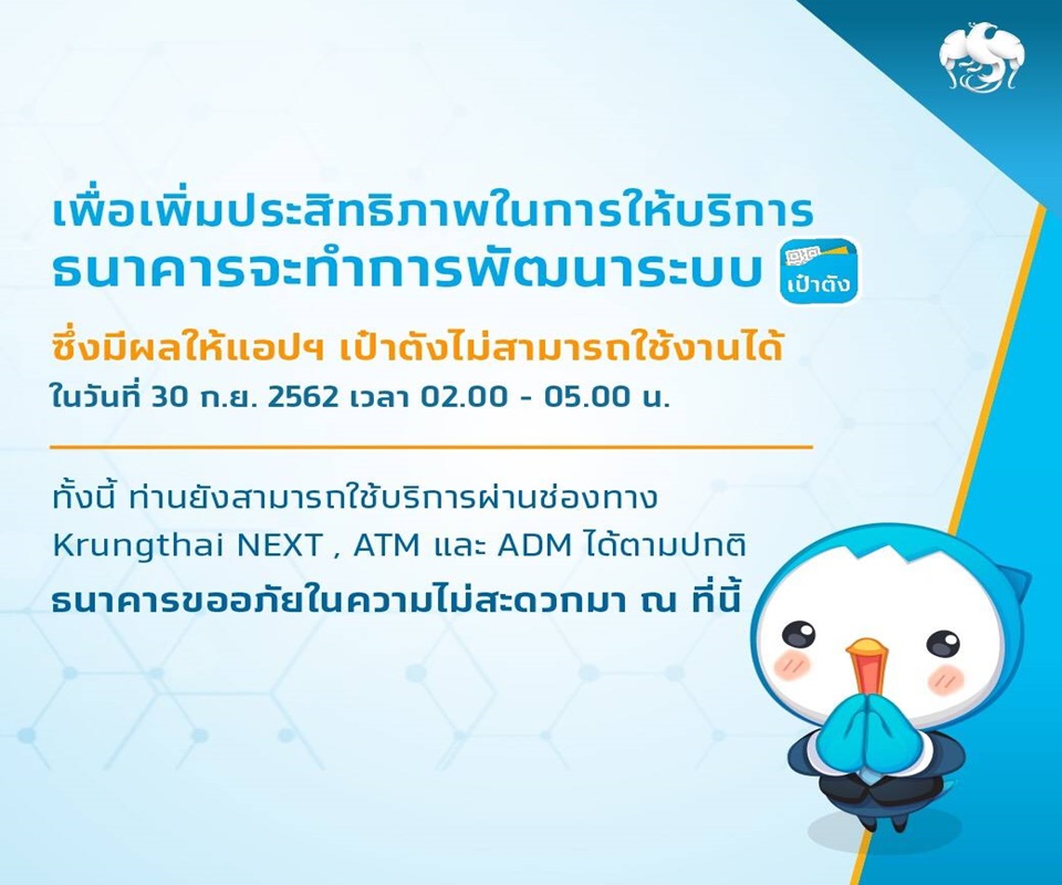 ธนาคารกรุงไทยแจ้งว่าจะทำการพัฒนาระบบ เพื่อเพิ่มประสิทธิภาพการให้บริการ ส่งผลให้แอปฯ เป๋าตังไม่สามารถใช้งานได้ระหว่างเวลา 02.00-05.00 น. ของวันที่ 30 กันยายน  2562 แต่ยังสามารถใช้บริการผ่านช่องทางกรุงไทย NEXT ATM และ ADM  ได้ตามปกติ ขออภัยในความไม่สะดวก.-สำนักข่าวไทย