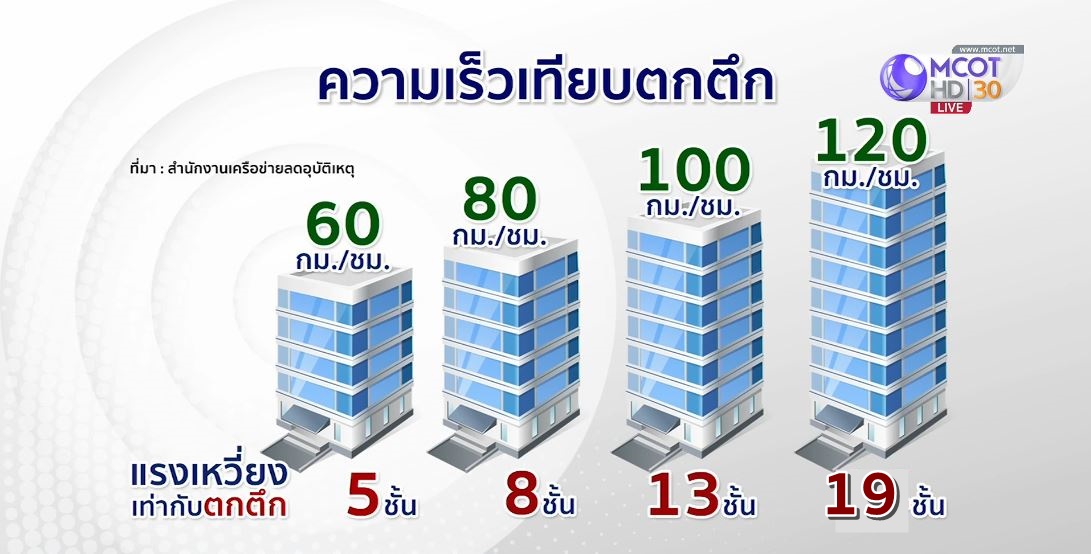 กรุงเทพฯ 30 ก.ย.- ผอ.สำนักงานเครือข่ายลดอุบัติเหตุ เผยรถที่ขับเร็ว แรง และยิ่งบรรทุกคนหรือสิ่งของมาจำนวนมาก ยิ่งทำให้เมื่อเกิดอุบัติเหตุ จะมีแรงเหวี่ยง แรงปะทะมากตามไปด้วย เช่น ถูกปะทะด้วยความเร็ว 60 กม./ชม. เท่ากับตกตึก 5 ชั้น ขณะที่ความเร็ว 120 กม./ชม. เท่ากับตกตึก 19 ชั้น