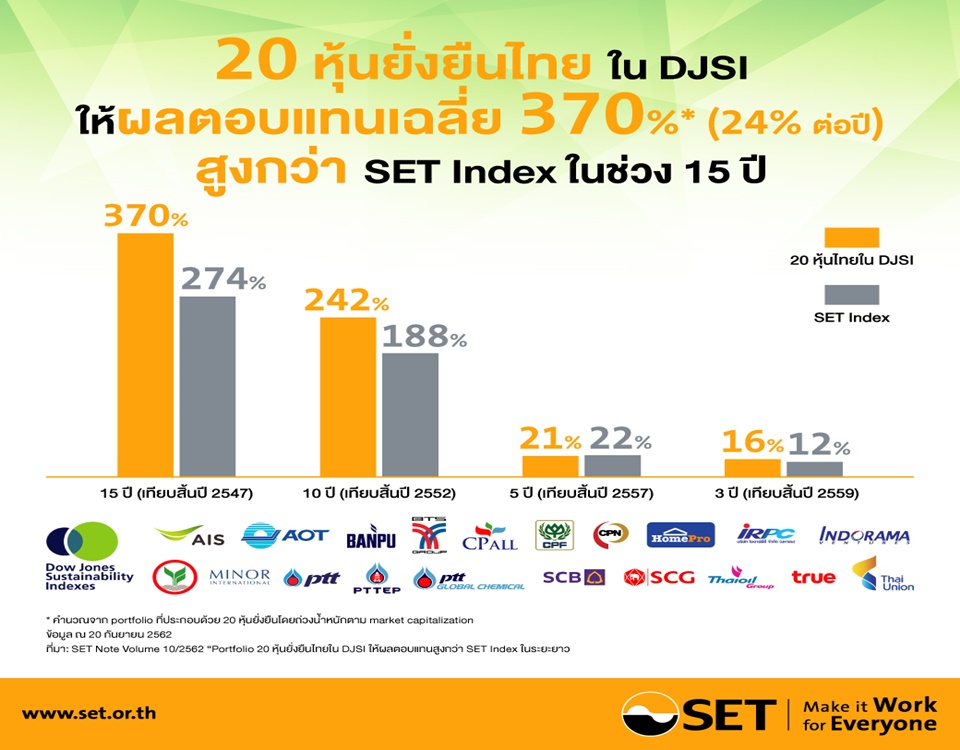 หากพิจารณาผลตอบแทนจากการลงทุนในหุ้นของบริษัทจดทะเบียนทั้ง 20 บริษัทที่เป็นองค์ประกอบใน DJSI ในปี 2562 จะพบว่าระยะยาวการลงทุนในหุ้นที่มีความโดดเด่นด้าน ESG ให้ผลตอบแทนสูงกว่า SET Index อย่างชัดเจน โดยในช่วงประมาณ 15 ปี (สิ้นปี 2547 – 20 กันยายน 2562) portfolio จำลองที่ประกอบด้วย 20 หลักทรัพย์ดังกล่าว ซึ่งคำนวณถ่วงน้ำหนักมูลค่าหลักทรัพย์ตามราคาตลาดให้ผลตอบแทนร้อยละ 370 หรือเฉลี่ยร้อยละ 24 ต่อปี ซึ่งสูงกว่า SET Index ที่ให้ผลตอบแทนร้อยละ 274 หรือ ร้อยละ 18 ต่อปี