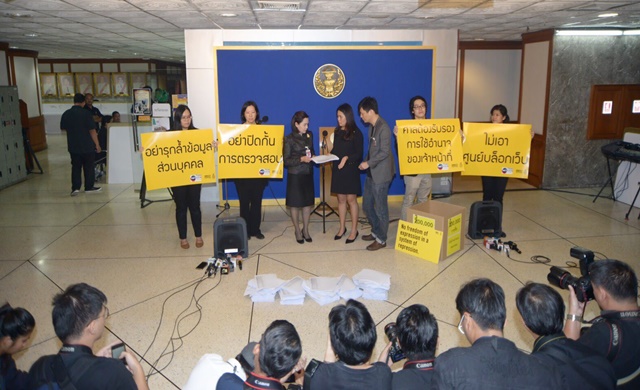 นางสฤณี อาชวานันทกุล พร้อมด้วยนายอาทิตย์ สุริยะวงศ์กุล ตัวแทนเครือข่ายพลเมืองเน็ตและน.ส.ปิยนุช โครตสาร องค์กรนิรโทษกรรมสากล หรือ แอมเนสตี้ อินเตอร์เนชั่นแนล ประเทศไทย เดินทางมายังอาคารรัฐสภา ยื่นรายชื่อประชาชน กว่า 300,000 รายชื่อ ที่ร่วมรณรงค์ผ่าน เว็บไซต์ change.org “ ต่อประธานสภานิติบัญญัติแห่งชาติ โดยมีนางวรารัตน์ อติแพทย์ เลขาธิการวุฒิสภาเป็นผู้รับเรื่อง