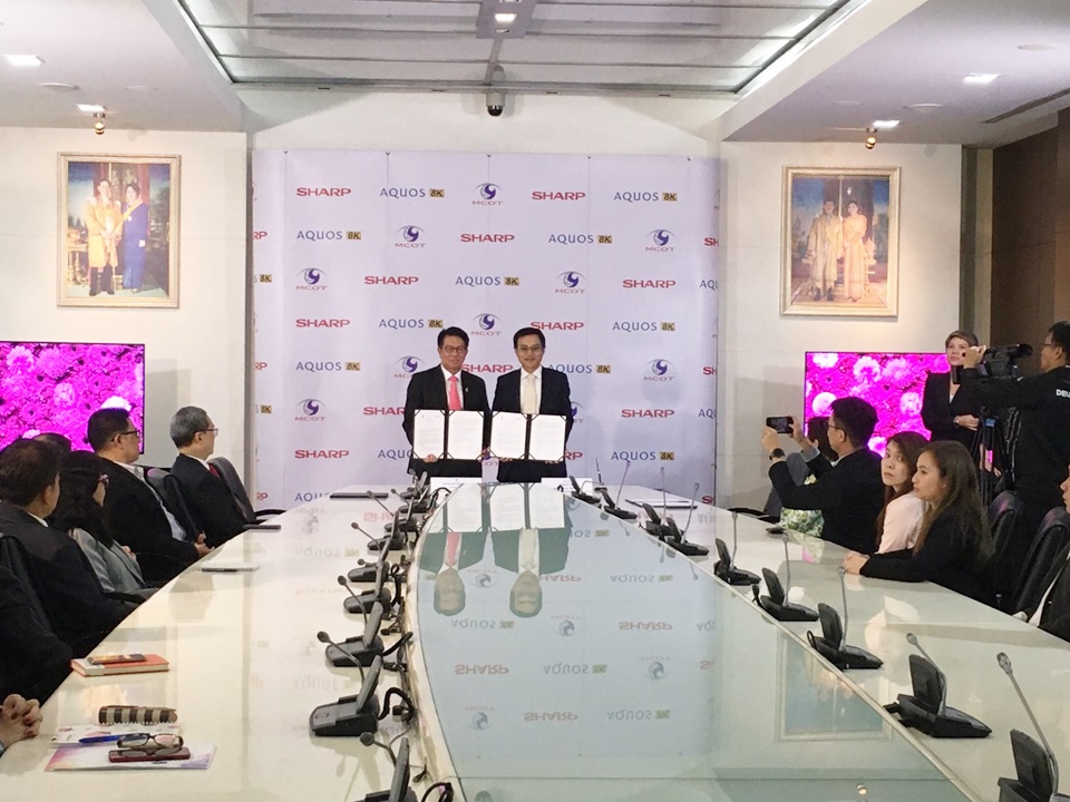 นายเขมทัตต์ พลเดช กรรมการผู้อำนวยการใหญ่บริษัท อสมท จำกัด (มหาชน) และนายโรเบิร์ต ฮู้ (Mr.Robert Wu) กรรมการผู้จัดการบริษัทชาร์ป ไทย จำกัด ร่วมลงนามบันทึกข้อตกลงความร่วมมือด้านการผลิต สื่อโทรทัศน์ด้วยเทคโนโลยี 8 K