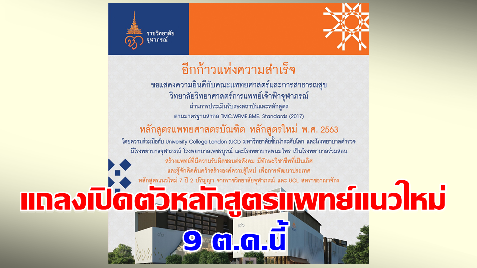ราชวิทยาลัยจุฬาภรณ์ เตรียมเปิดตัวหลักสูตรแพทยศาสตรบัณฑิตแนวใหม่ครั้งแรกในประเทศไทยเรียน 7ปี รับ 2 ปริญญา โดยความร่วมมือกับ University College London (UCL) มหาวิทยาลัยชั้นนำระดับโลก และ รพ.ตำรวจ พร้อมสร้างแพทย์ที่มีความรับผิดชอบต่อสังคม มีทักษะวิชาชีพที่เป็นเลิศและรู้จักคิด ค้นคว้าสร้างองค์ความรู้ใหม่ สนองพระปณิธานใน ศาสตราจารย์ ดร.สมเด็จพระเจ้าน้องนางเธอ เจ้าฟ้าจุฬาภรณวลัยลักษณ์ อัครราชกุมารี กรมพระศรีสวางควัฒน วรขัตติยราชนารี