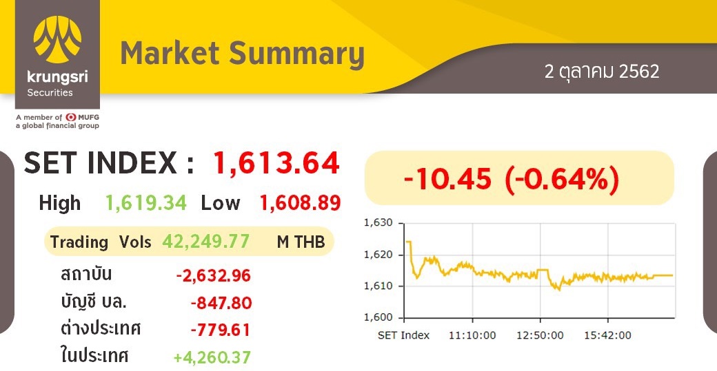 ผู้สื่อข่าวรายงานว่าดัชนีตลาดหลักทรัพย์ฯ ปิดวันนี้ (2 ต.ค.) ที่ระดับ 1,613.64 จุด ลดลง 10.45 จุด หรือ0.64% มูลค่าการซื้อขาย 42,249.77 ล้านบาท ดัชนีเคลื่อนไหวแดนลบตลอดทั้งวัน ทำระดับสูงสุด 1,619.34 จุด และต่ำสุด 1,608.89 จุด