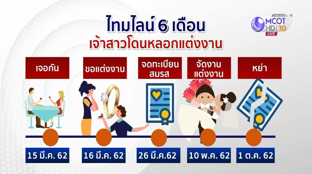 สำนักข่าวไทย 2 ต.ค.- กรณีพริตตี้สาวชาวบุรีรัมย์ร้องถูกเจ้าบ่าวอ้างเป็นเสี่ยหมื่นล้าน หลอกแต่งงานจนเป็นหนี้กว่า 3.5 ล้านบาท สำนักข่าวไทย แกะรอยเส้นทาง “รักแรกพบ” ของอดีตเจ้าสาวและอดีตเจ้าบ่าวรายนี้ พบว่าประมาณ 6 เดือน ทั้งคู่ประกอบพิธีกรรมต่างๆ ไม่ว่าจะเป็นขอแต่งงาน, แต่งงาน, จดทะเบียน และจดทะเบียนหย่า มีไทม์ไลน์ดังนี้