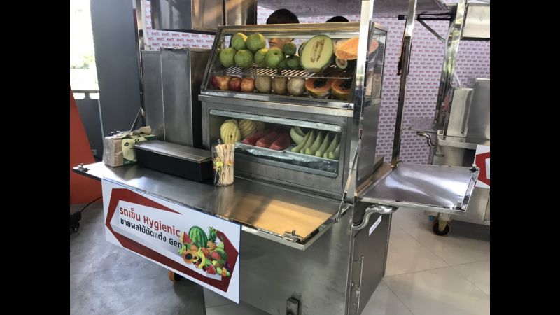 The newly-designed fruit push cart separates ice from fruit but can still keep freshness of fruit all day. A special hole is added to keep fruit waste for cleanliness.