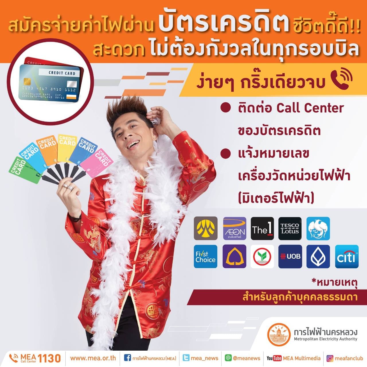 การไฟฟ้านครหลวง (MEA) อำนวยความสะดวกให้กับผู้ใช้ไฟฟ้าทุกคน ไม่ต้องรอบิล ไม่ต้องนำบิลไปจ่ายที่สาขา หรือจุดรับชำระค่าไฟฟ้า เพราะเดี๋ยวนี้ใคร ๆ ก็สมัครจ่ายค่าไฟฟ้าผ่านการหักบัญชีบัตรเครดิตกันทั้งนั้น