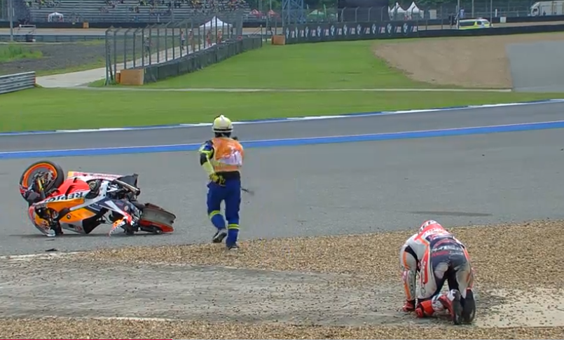 ศึกมอเตอร์ไซค์ชิงแชมป์โลก สนามที่ 15 ศึกพีทีที ไทยแลนด์ กรังด์ปรีซ์ 2019 วันที่ 4-6 ตุลาคมนี้ ที่ช้าง อินเตอร์เนชั่นแนล เซอร์กิต จ.บุรีรัมย์ วันนี้เป็นรอบทดสอบสนาม แต่กลับเกิดเหตุการณ์ไม่คาดคิดขึ้น เมื่อ มาร์ก มาร์เกซ นักบิดชาวสแปนิชจากทีมเรปโซล ฮอนด้า ที่กำลังลุ้นคว้าแชมป์โลกสมัยที่ 6 ในปีนี้ ประสบอุบัติเหตุรถพลิกคว่ำในโค้งที่ 7 จนเจ้าตัวต้องคุกเข่าอยู่กับพื้น ก่อนจะถูกนำตัวส่งไปเช็กอาการโดยด่วนว่า มีอาการบาดเจ็บมากน้อยแค่ไหน และยังไม่มั่นใจว่าจะสามารถลงแข่งขันในรอบจัดอันดับ และแข่งขันจริงได้หรือไม่.-สำนักข่าวไทย