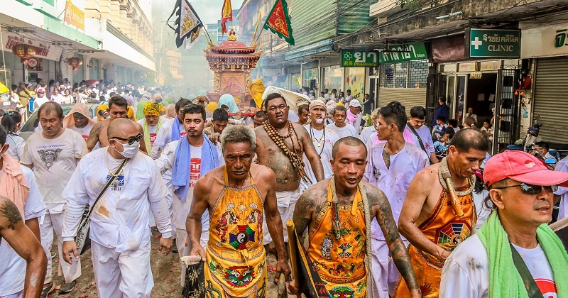 บรรยากาศงานประเพณีถือศีลกินผักจังหวัดภูเก็ต ประจำปี 2562 ระหว่างวันที่ 29 ก.ย.-7 ต.ค. ซึ่งวันนี้ (4 ต.ค.) มีการประกอบพิธีอิ้วเก้งหรือพิธีแห่พระรอบเมืองของศาลเจ้าบางเหนียว ซึ่งเป็นศาลเจ้าเก่าแก่อีกแห่งหนึ่งในจังหวัดภูเก็ต โดยมีร่างทรงหรือม้าทรงชายล้วนกว่า 500 คน ร่วมมาในขบวน ขณะที่เส้นทางต่าง ๆ ที่ขบวนแห่พระผ่านหนาแน่นไปด้วยผู้คนที่ออกมารอรับขบวนพระ และชมการแสดงอิทธิฤทธิ์ของม้าทรง ด้วยการใช้เหล็กแหลมและของมีคมทรมานร่างกาย ซึ่งเชื่อกันว่าเป็นการรับเคราะห์แทนผู้ถือศีลกินผัก ส่งผลให้การประกอบพิธีแห่พระในเช้าวันนี้เป็นไปอย่างคึกคัก