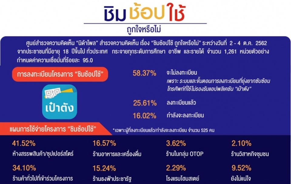 ศูนย์สำรวจความคิดเห็น “นิด้าโพล” สถาบันบัณฑิตพัฒนบริหารศาสตร์ (นิด้า) สำรวจความคิดเห็นของประชาชน เรื่อง “ชิมช้อปใช้…ถูกใจหรือไม่” ทำการสำรวจระหว่างวันที่ 2 – 4 ตุลาคม 2562 จากประชาชนที่มีอายุ 18 ปีขึ้นไป กระจายทุกภูมิภาค ระดับการศึกษา และอาชีพทั่วประเทศ รวมทั้งสิ้น 1,261 หน่วยตัวอย่าง พบว่า ส่วนใหญ่ ร้อยละ 58.37 ระบุว่าจะไม่ลงทะเบียน เพราะระบบและขั้นตอนการลงทะเบียนยุ่งยากซับซ้อน ลงยังไงก็ไม่สำเร็จ โทรศัพท์ที่ใช้ไม่รองรับแอปพลิเคชัน “เป๋าตัง” ขณะที่บางส่วนระบุว่าไม่มีเวลา/ไม่สะดวกที่จะลงทะเบียน ยังไม่ทราบรายละเอียดของโครงการ และไม่สนใจ/ไม่เห็นด้วย กับโครงการนี้เลย รองลงมา ร้อยละ 25.61 ระบุว่าลงทะเบียนแล้ว และร้อยละ 16.02 ระบุว่ากำลังจะลงทะเบียน