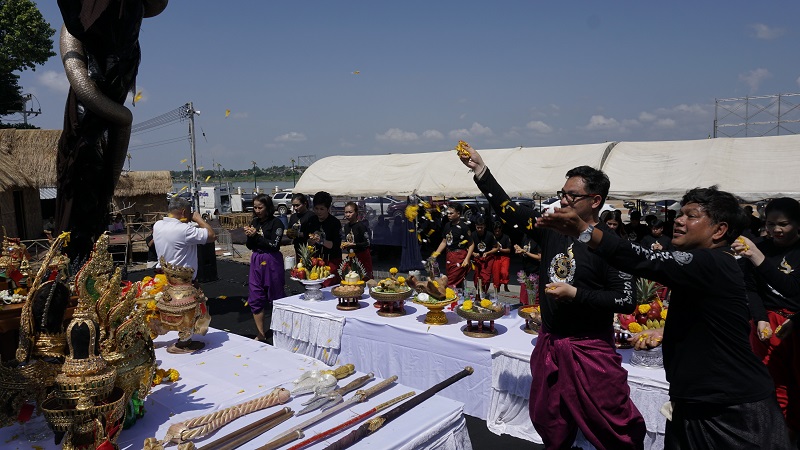 หนองคาย 6 ต.ค.- คณะนักแสดงแสงเสียงเปิดตำนานบั้งไฟพญานาค ทำพิธีไหว้ครู บวงสรวงสิ่งศักดิ์สิทธิ์ ก่อนเปิดการแสดงในงานออกพรรษาบั้งไฟพญานาค ริมแม่น้ำโขงหนองคาย 10-13 ต.ค.นี้